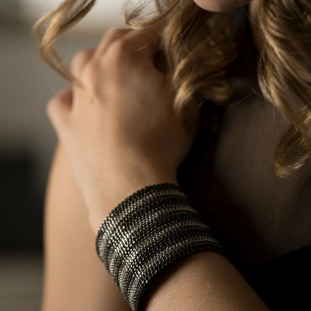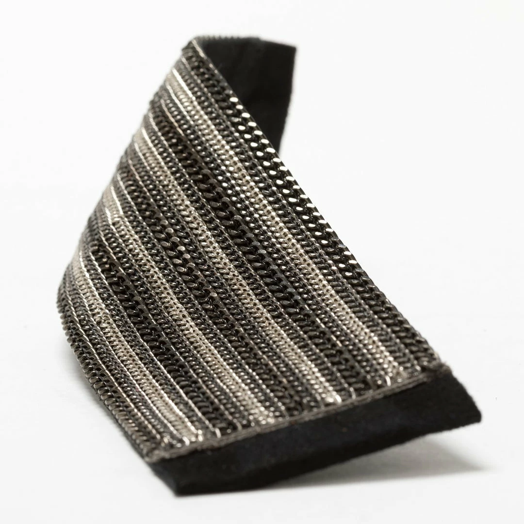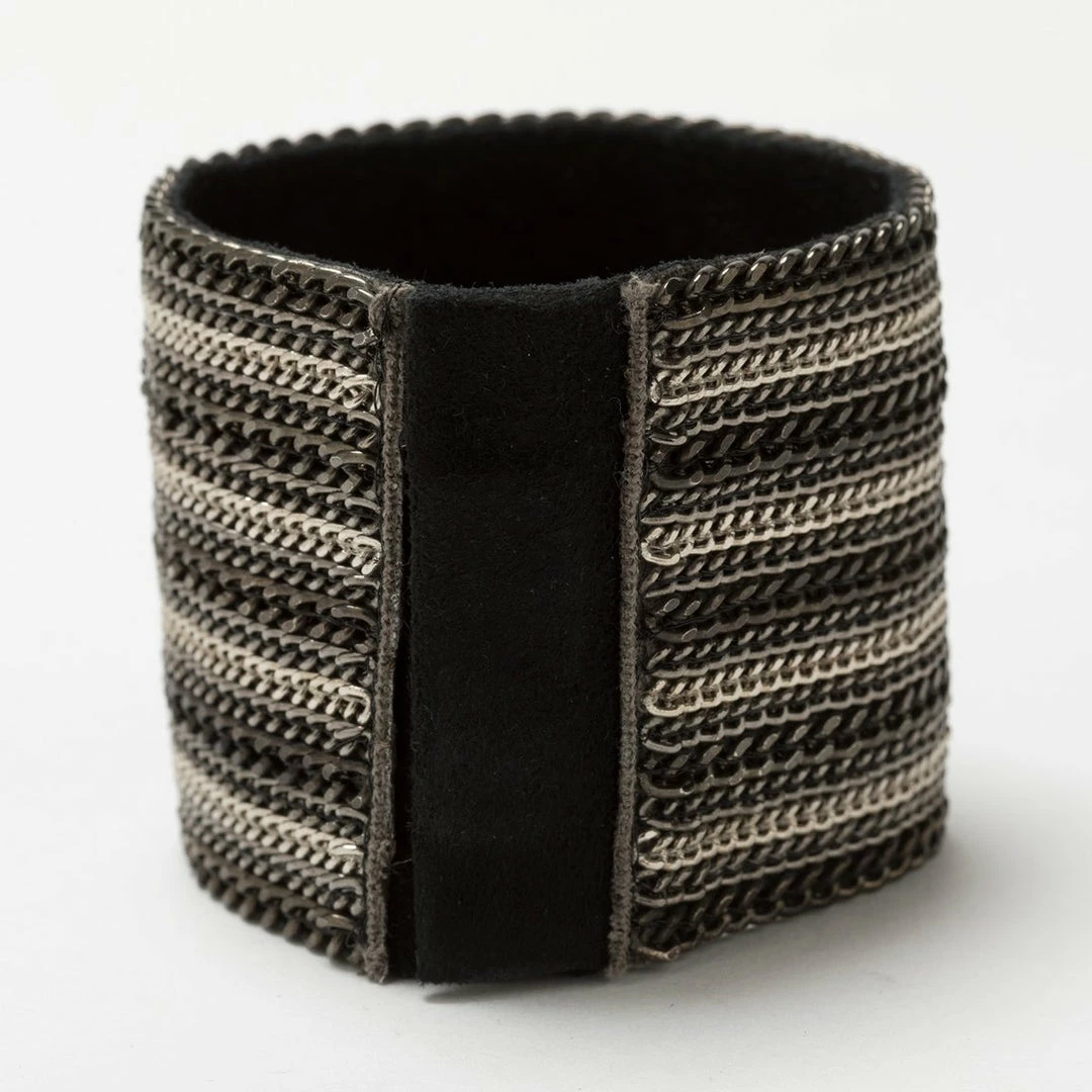 Fiercely strong and elegantly beautiful, this modern chainmail cuff bracelet protects with style. Rows of silver and bronze chains are stitched to a base of black suede and sealed with a magnet.