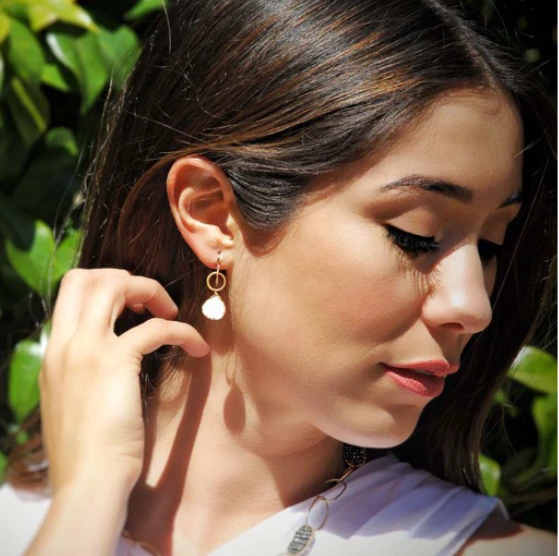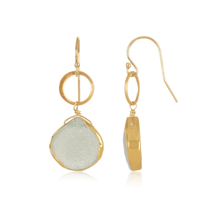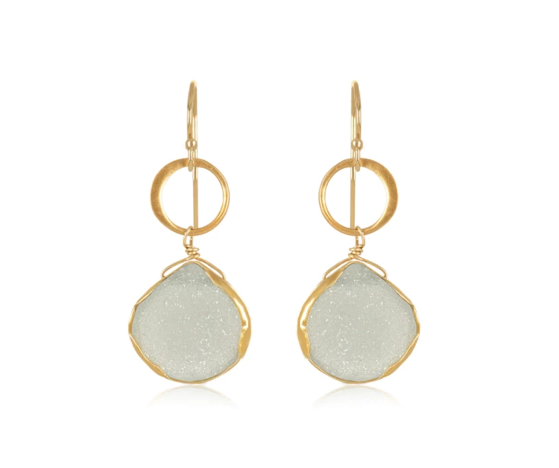 Rare and special, the popular Blue Moon earrings handset in warm 14K gold plated features a sparkling druzy stone in white. Whether you are a bride looking for your something blue, looking for a unique gift for your bridesmaids, or maybe you just want to add a little sparkle to your night out on the town, the blue moon druzy earrings are the way to go!