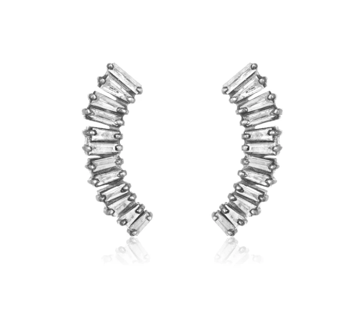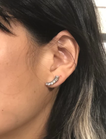 Baguette diamonds stacked on top of each other to create a half circle, set in sterling silver, on sterling silver posts.