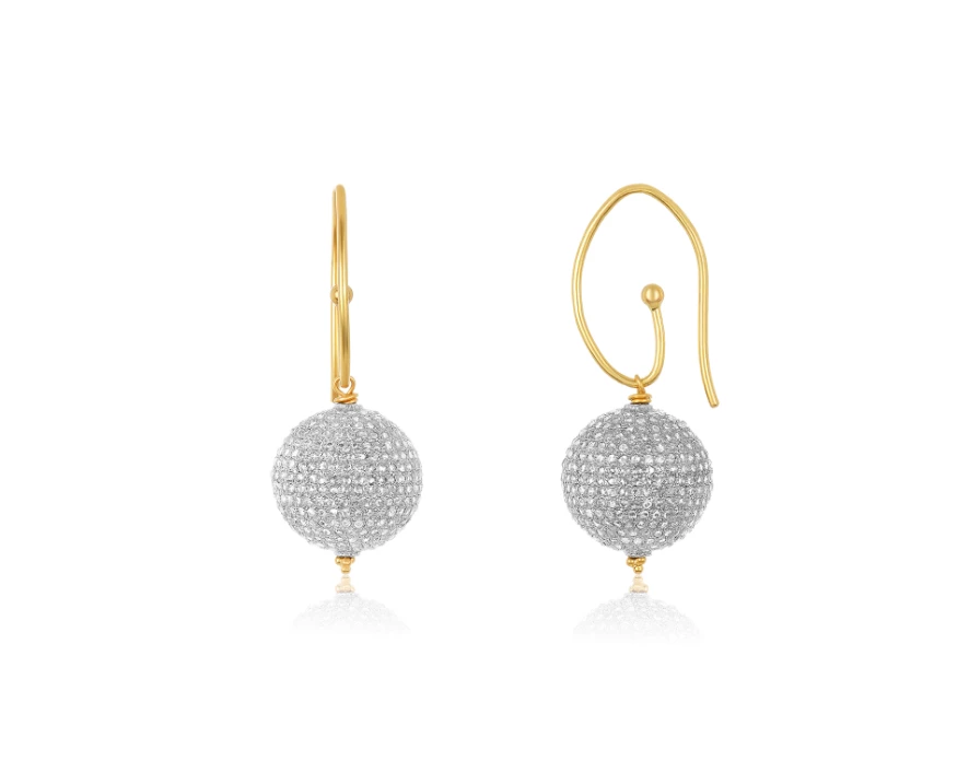 18K swirl gold ear hook with stunning round pave white diamond balls.