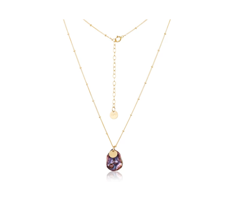 Peacock color flake pearl on silver disc and oxidized sterling silver with white silver beaded chain.