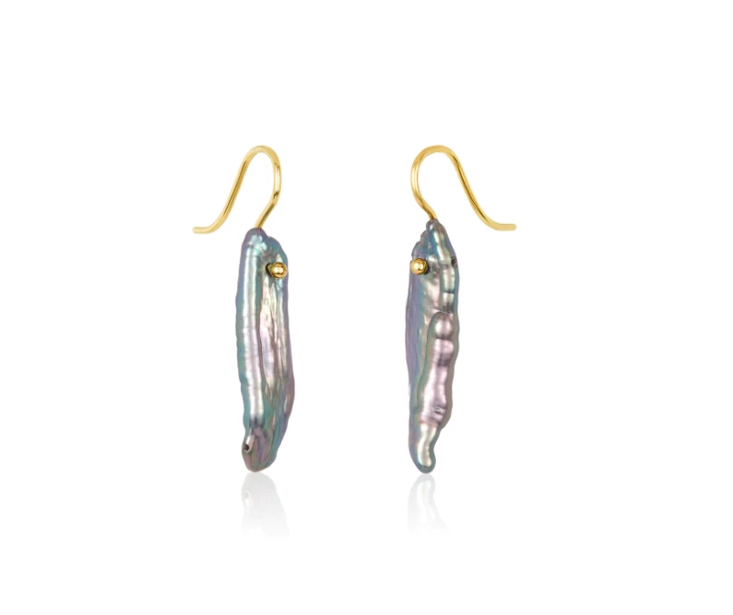 Radiant peacock color biwa pearls simply set on gold filled ear wires.