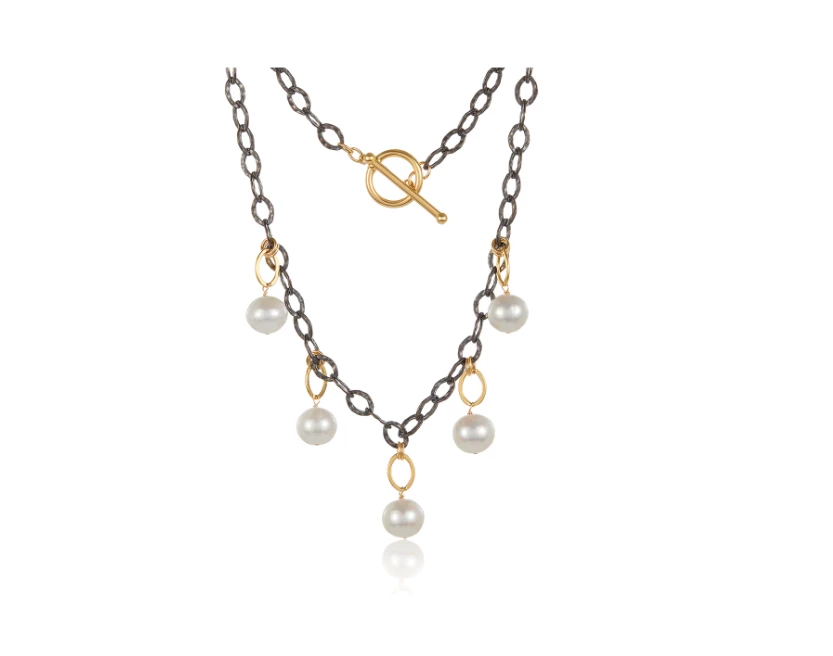 White fresh water pearls on thick oxidzied sterling silver chain with gold filled accents.
