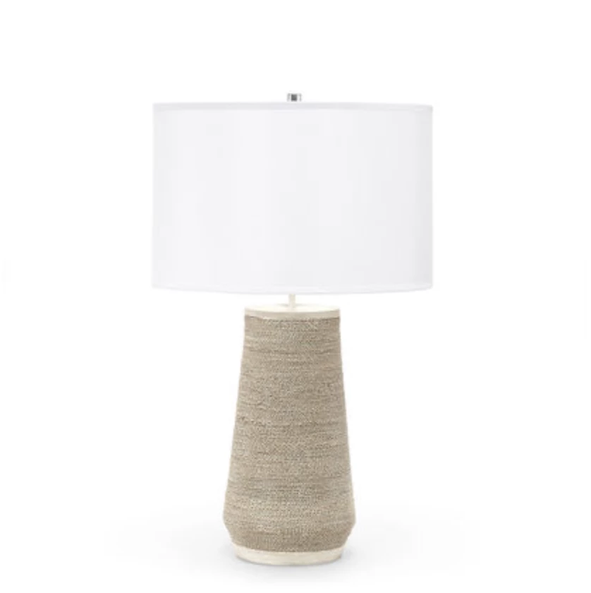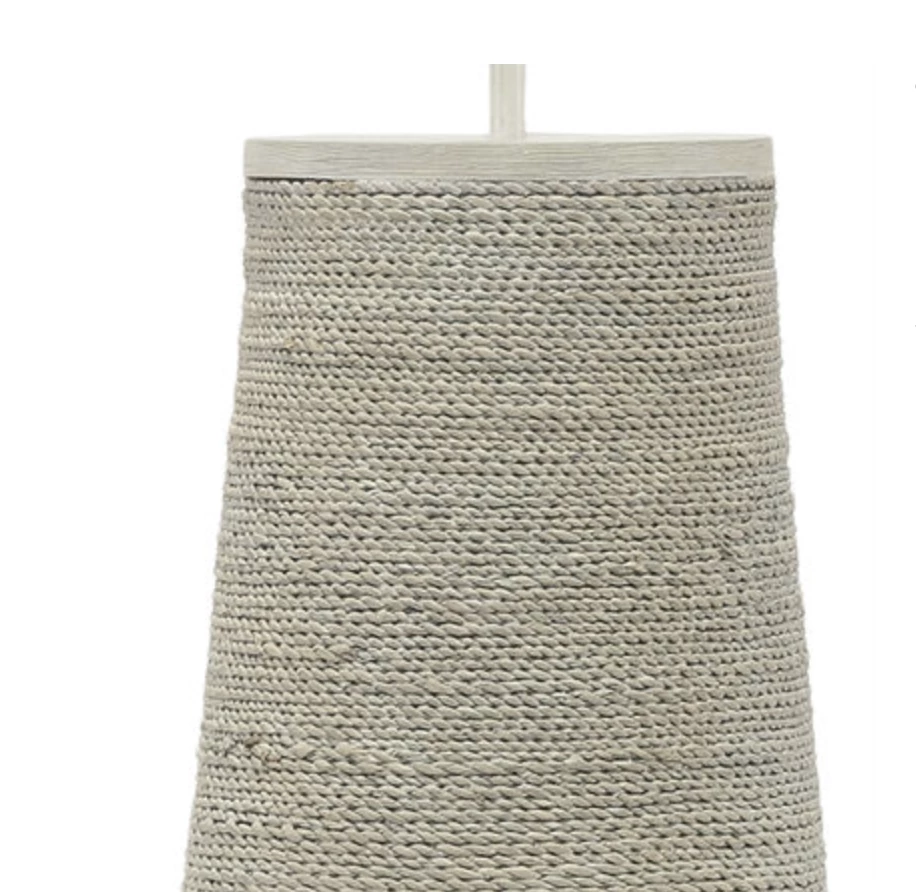 A gorgeous Lampakana rope in a whitewash finish accented with wood caps in soft white with a white round drum shade and a nickel cylinder finial.