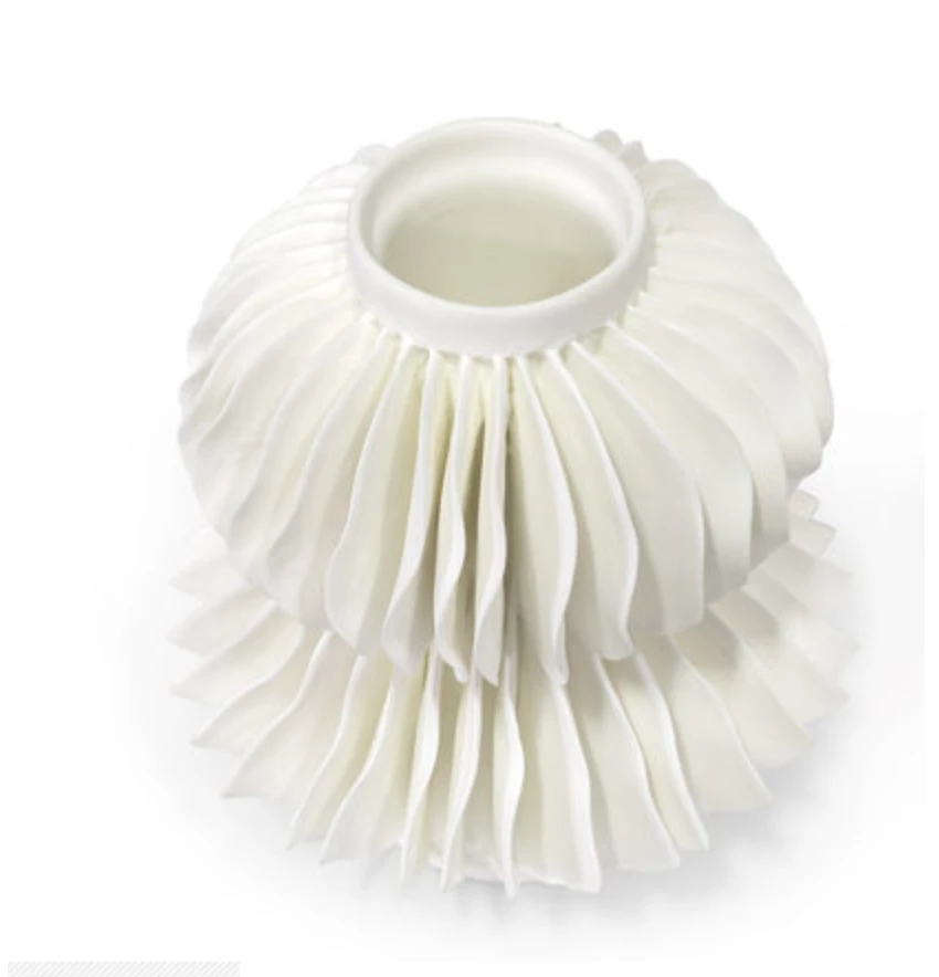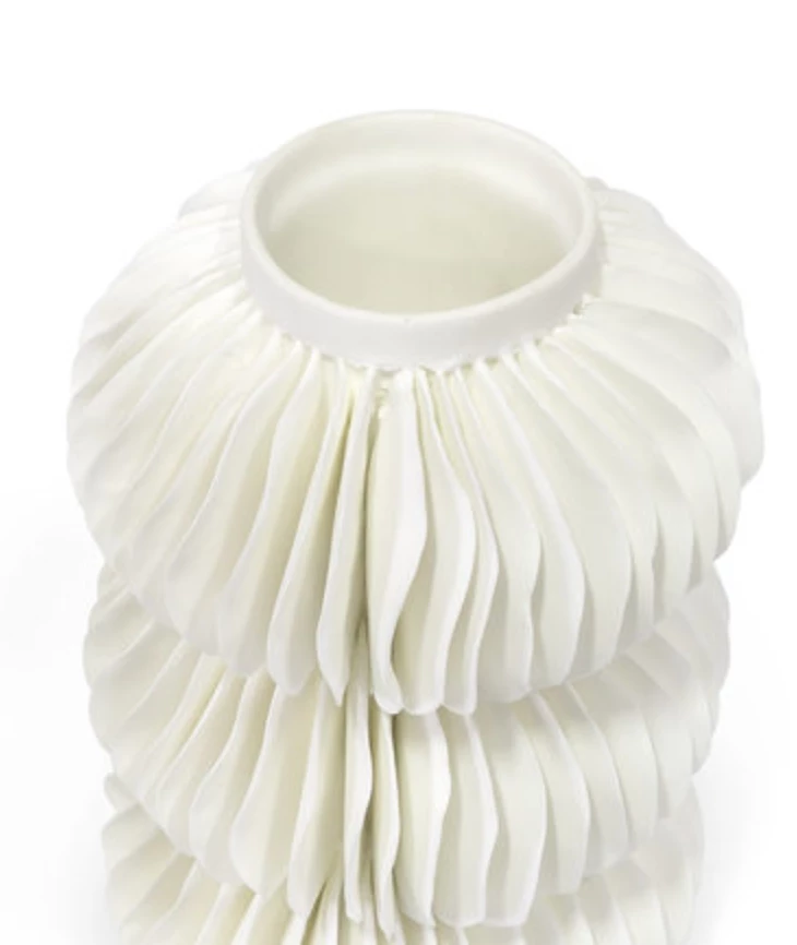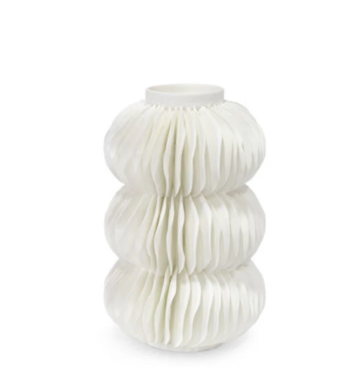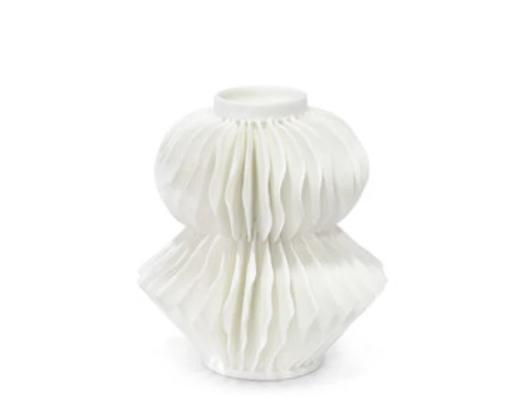 This vase is made of fine bone china in a white finish. Bone china is a durable form of porcelain composed of clay, bone ash and other minerals.