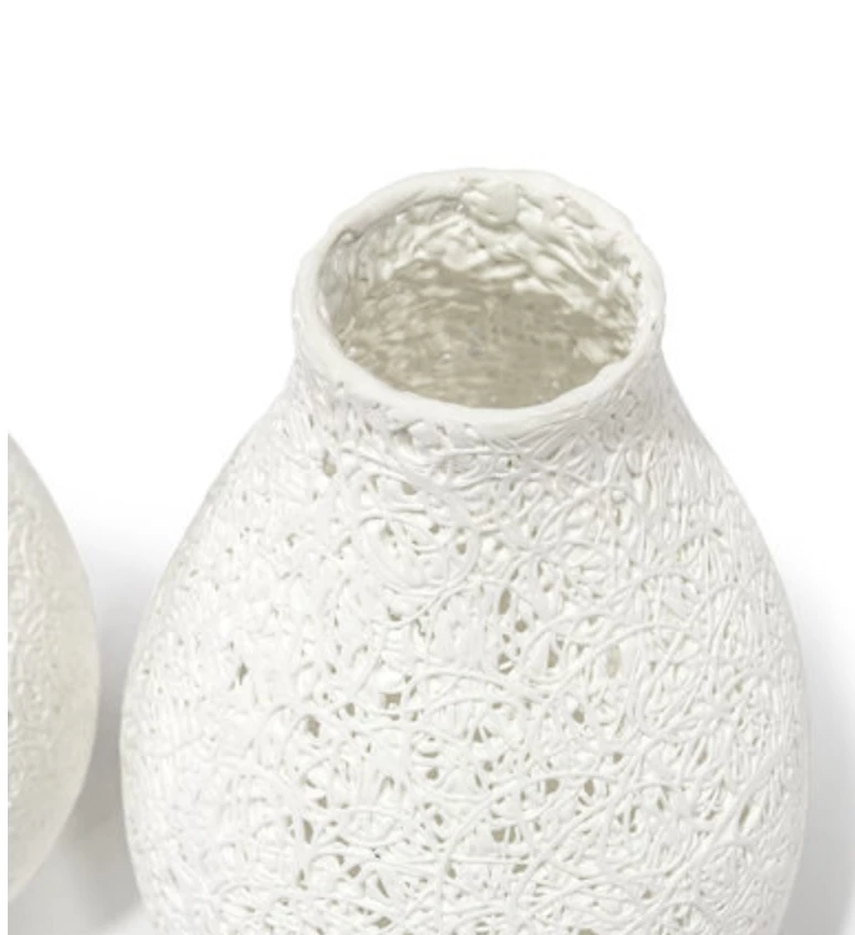 This white stone cast vase with sea urchin inspired details and texture.Vessel is made of fine bone china in a white finish. Bone china is a durable form of porcelain composed of clay, bone ash and other minerals.