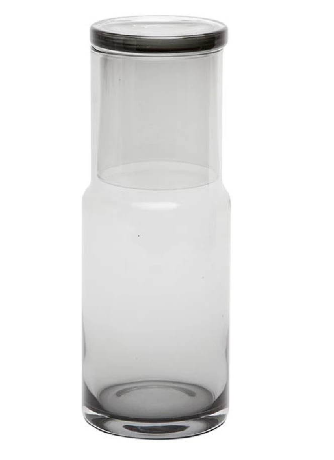 Beautiful light grey glass carafe with built-in tumbler. Perfect for your bedside table.