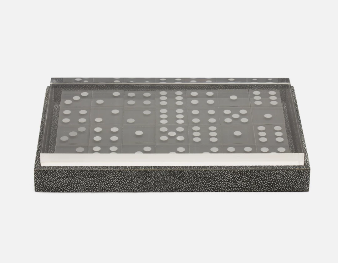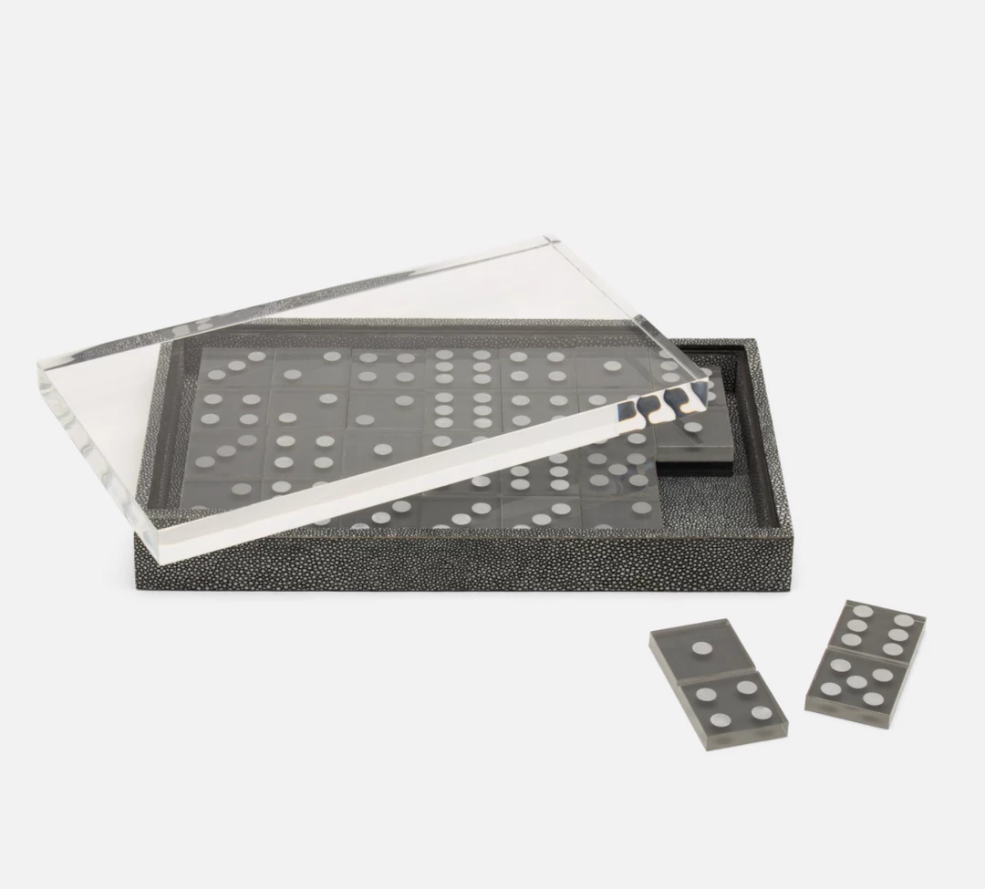 Faux shagreen domino set with resin pieces and a clear acrylic top.