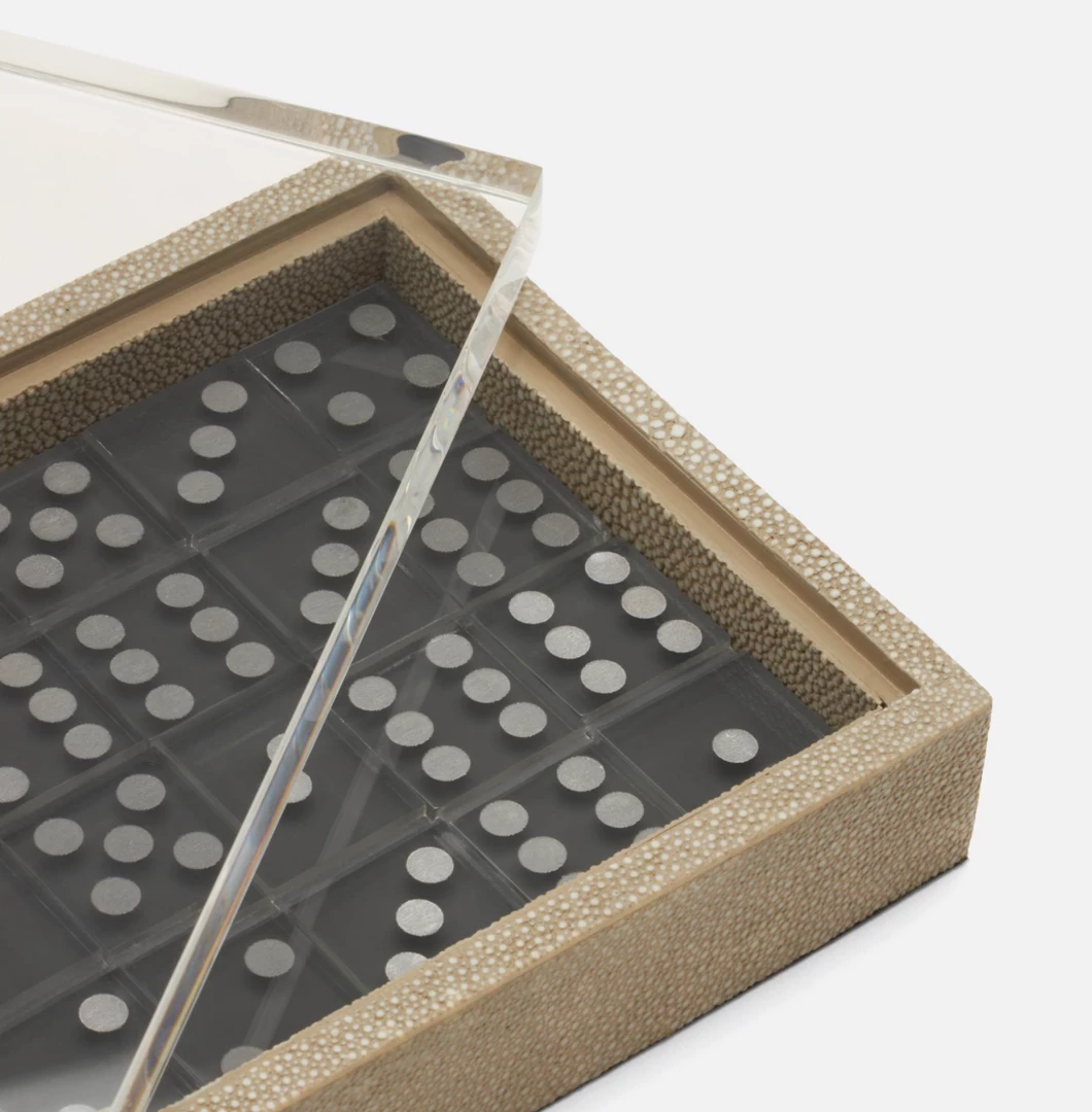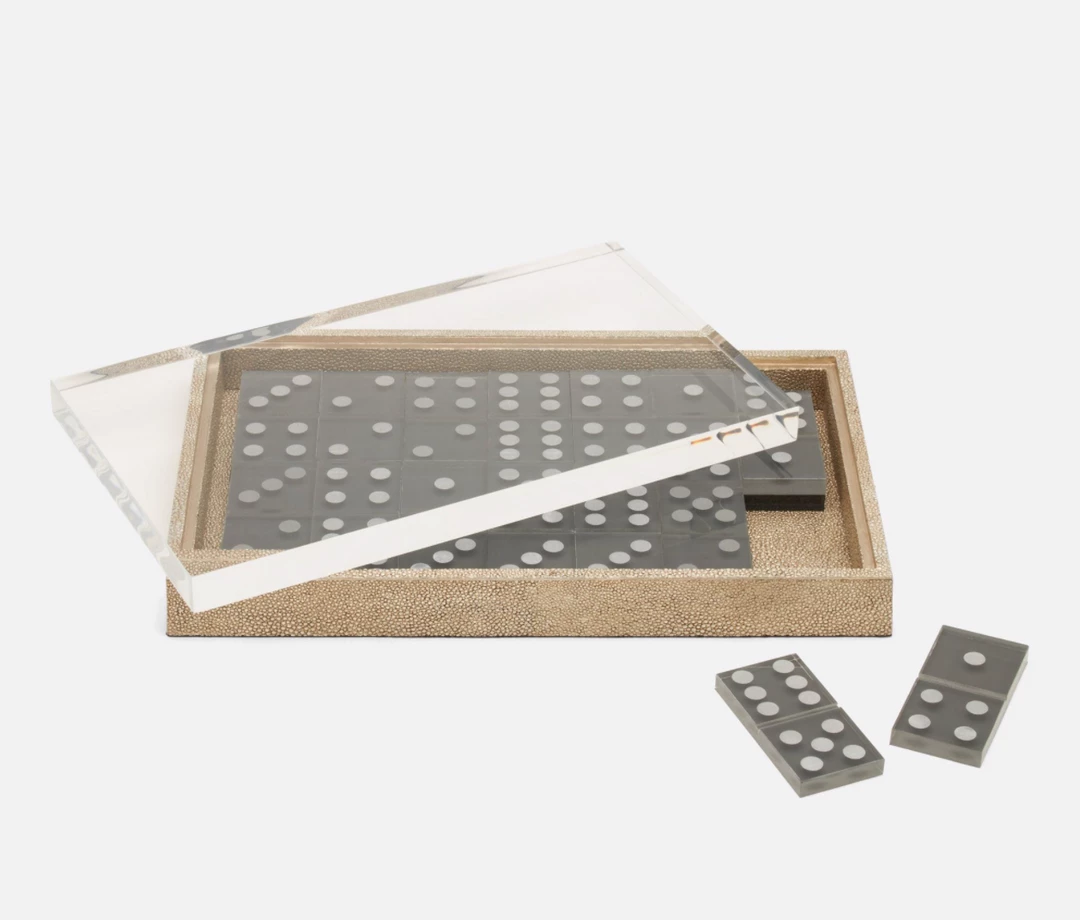 Faux shagreen domino set with resin pieces and a clear acrylic top.