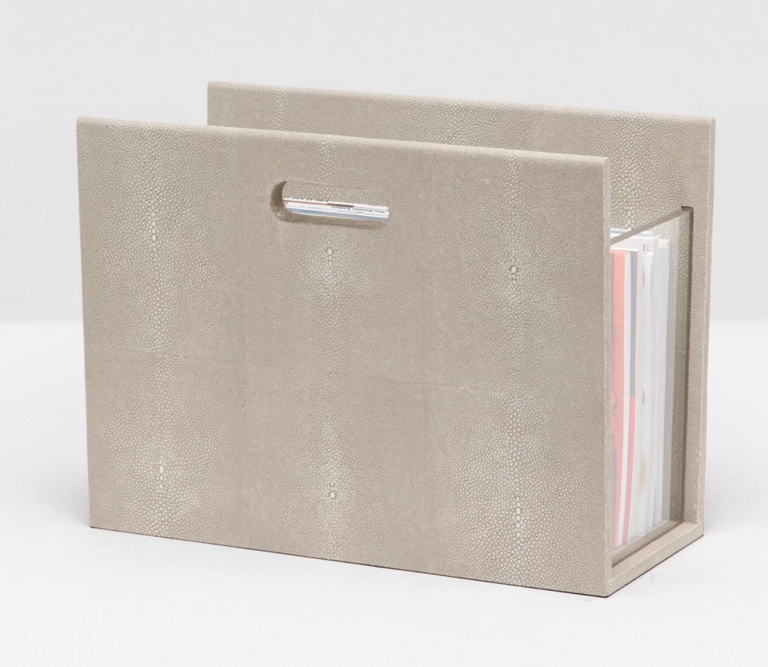 Luxe faux shagreen magazine holder with transparent clear acrylic detail.