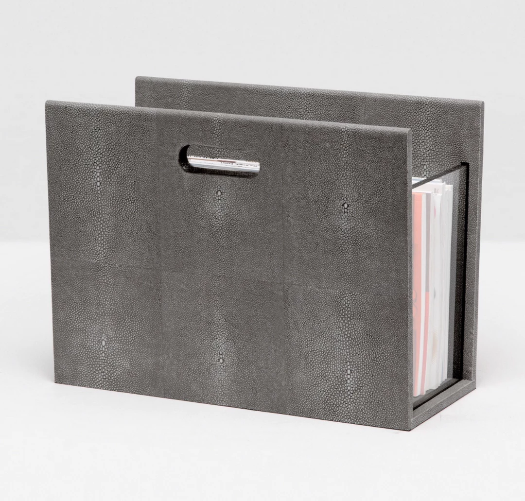 Luxe faux shagreen magazine holder with transparent clear acrylic detail.