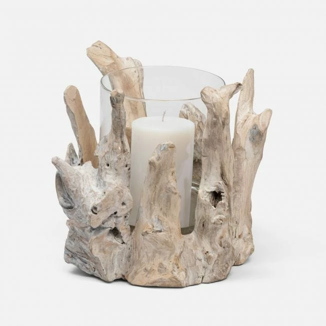 Beachy hurricanes made of whitewashed driftwood. Glass insert included.