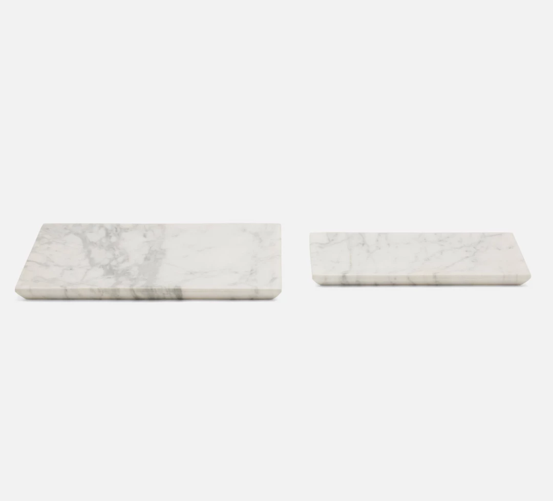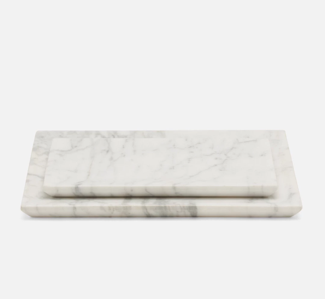 These white marble trays are simply luxurious on a vanity or bathroom shelf.