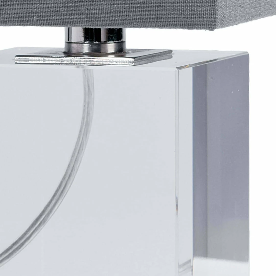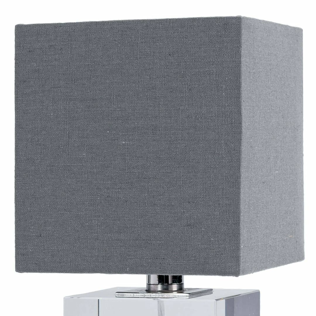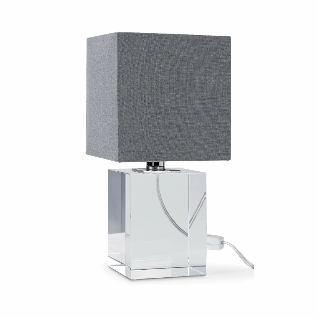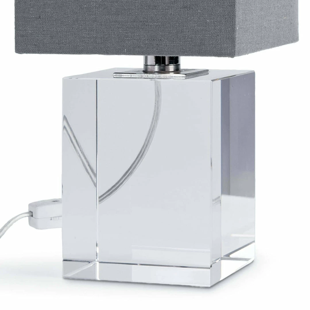 The thoughtful contrast of blocked crystal and a traditional charcoal shade, gives way to modern and minimalist piece. This versatile and contemporary lamp lends itself to a variety of settings, making it a perfect option for the living room, bedroom, or sitting room.