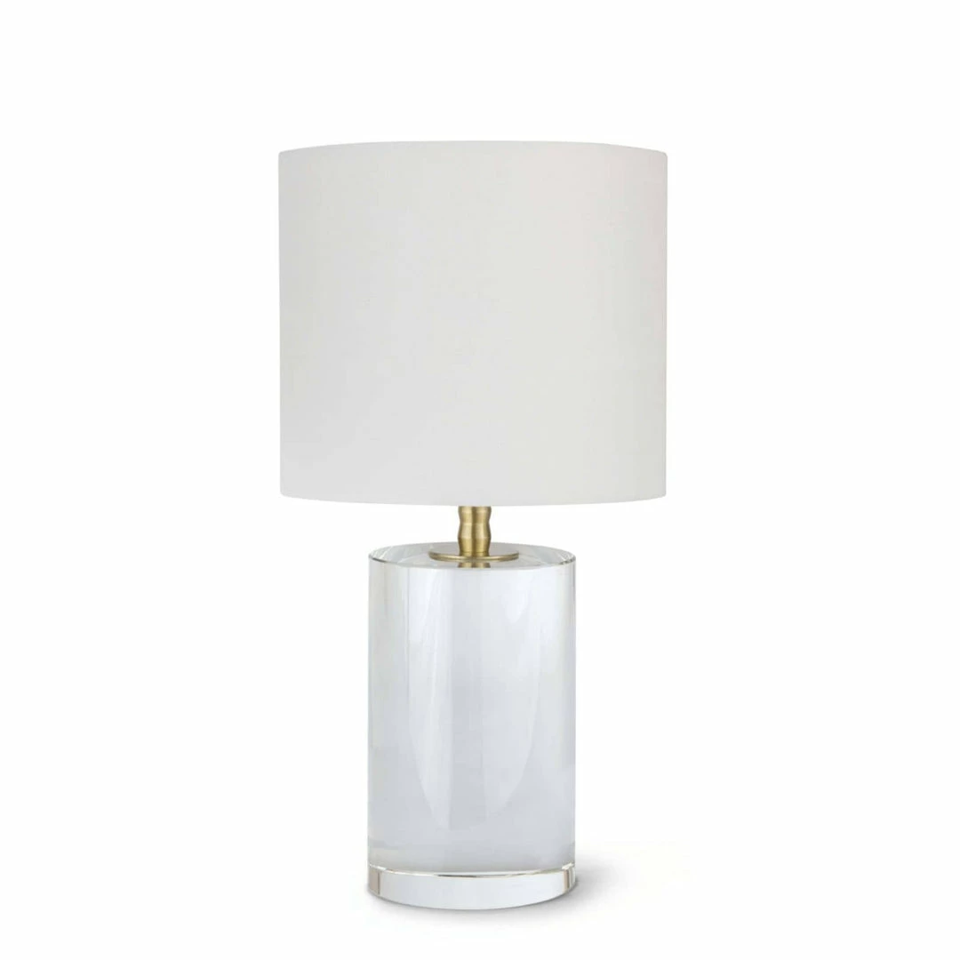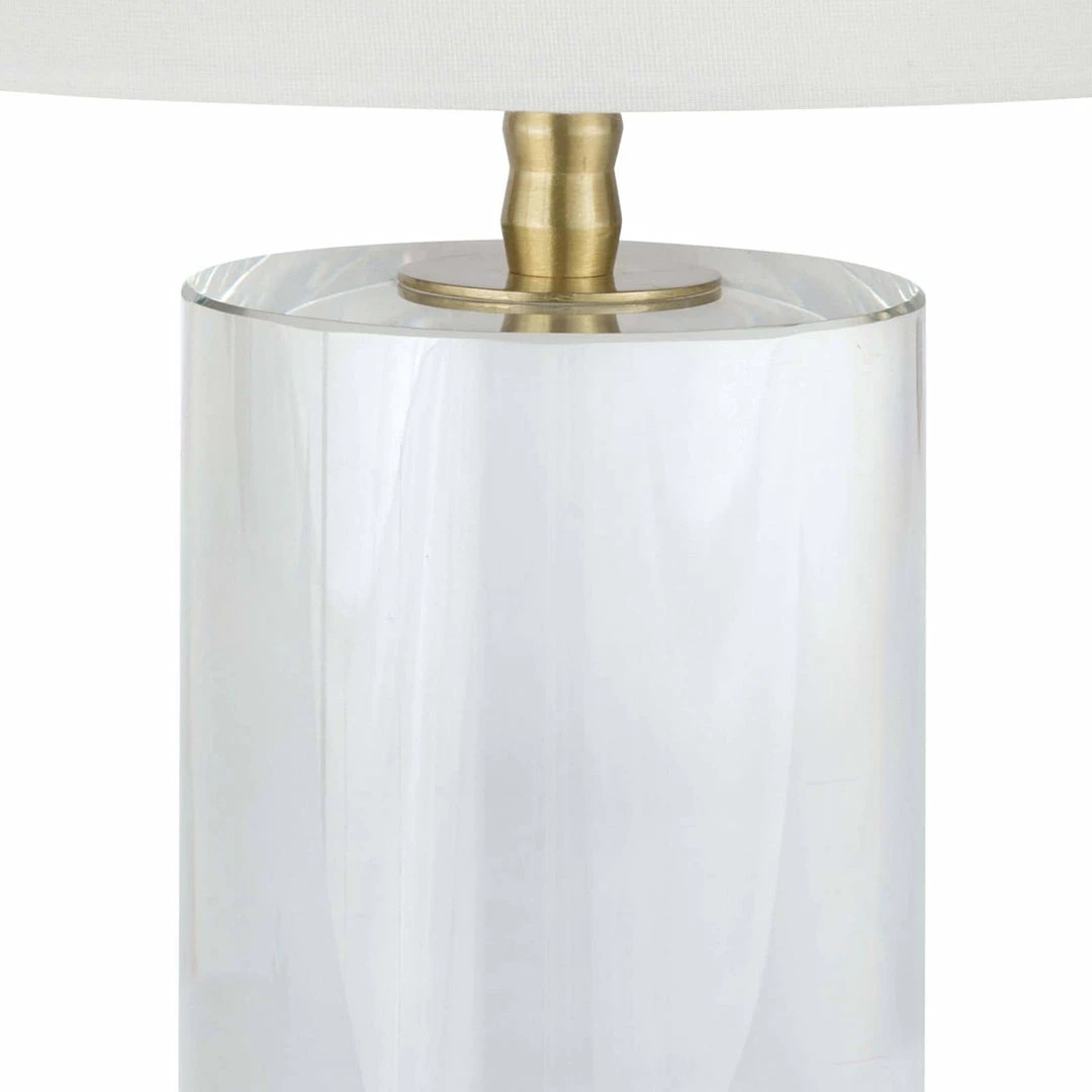 Stunning and elegant, the Juliet Table Lamp is crafted of optical crystal, fitted with natural brass hardware and topped with a natural linen drum shade. This clear and sculptural lamp lends itself to a variety of settings, making it a versatile option for the living or bedroom, or in pairs atop side tables flanked on each side of a sofa.