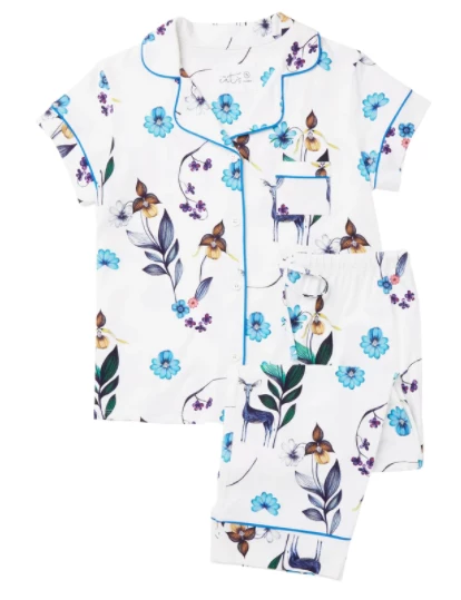- Short-Sleeved pajama top and capri-length pant with pockets