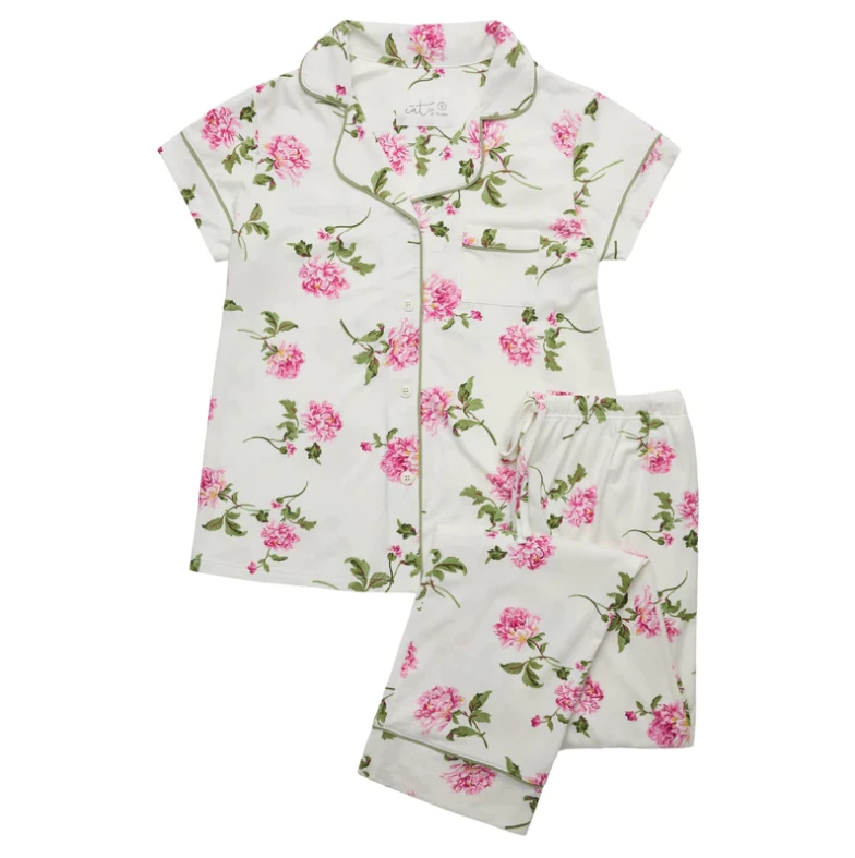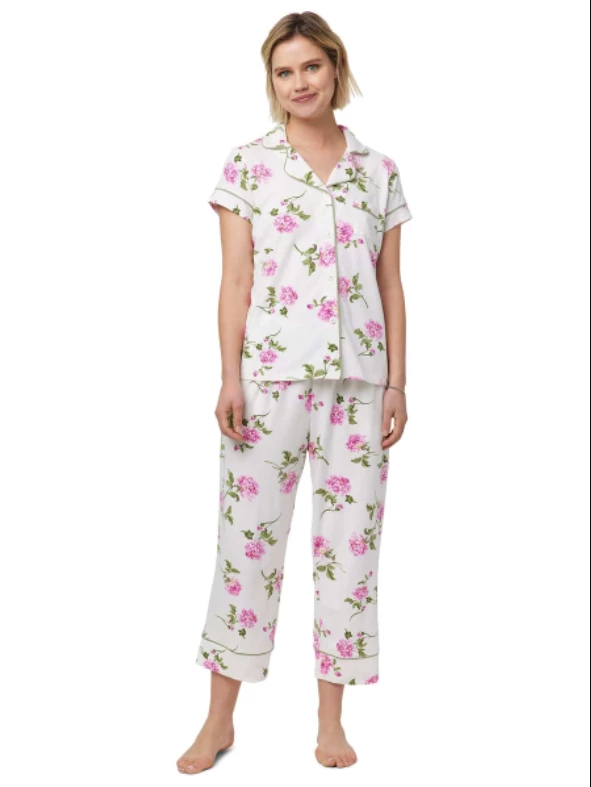 - Short-Sleeved pajama top and capri-length pant with pockets