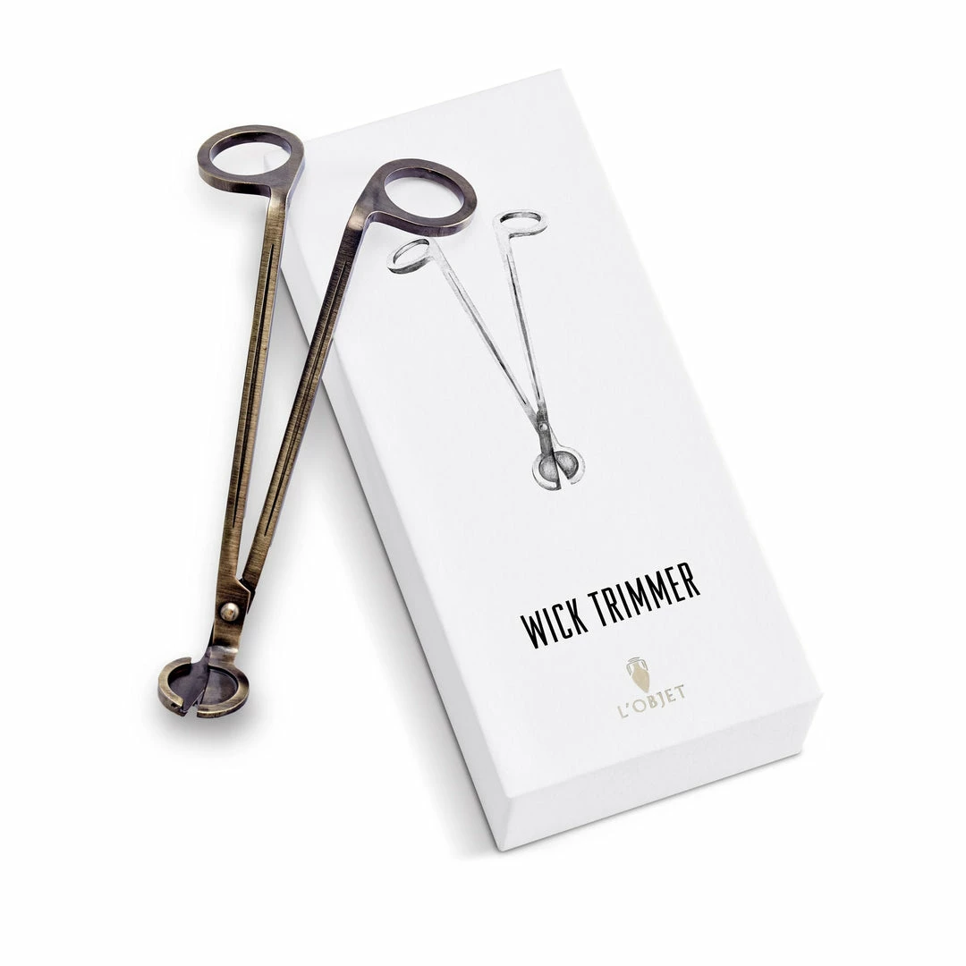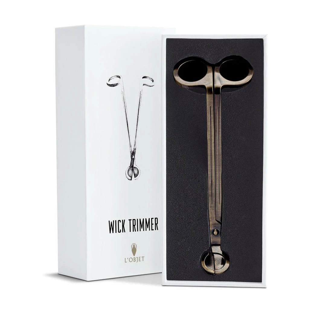 Brass wick trimmer presented in a luxury gift box. Enhances the experience of burning your favorite L’Objet candle.